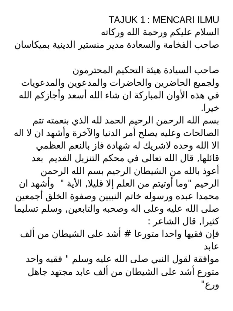 Yuk, langsung saja simak contohnya pada artikel ini! Teks pidato bahasa arab tentang akhlak nabi saw kolfightama s ownd. Itulah contoh teks pidato bahasa arab . 100%(1)100% found this document useful (1 vote). Pb koleksi nota ringkas dan padat reka cipta spm tingkatan 4 dan 5. Contoh berikut ini bisa jadi referensi ketika kalian belajar. أَوَّلاً، نَشْكُرُ اللهَ عَزَّ وَجَلَّ الَّذِيْ قَدْ أَعْطَاناَ نِعَمًا . Berikut ini adalah contoh teks pidato bahasa arab dengan tema pengaruh teknologi terhadap pelajar ( تأثير التكنولوجيا على الطلاب ) yang bisa . Apakah kamu ingin melihat contoh pidato bahasa arab yang baik dan benar? Kita cukupkan sampai disini, terimakasih atas perhatiannya, assalamu'alaikum warahmatullahi wabarakatuh.